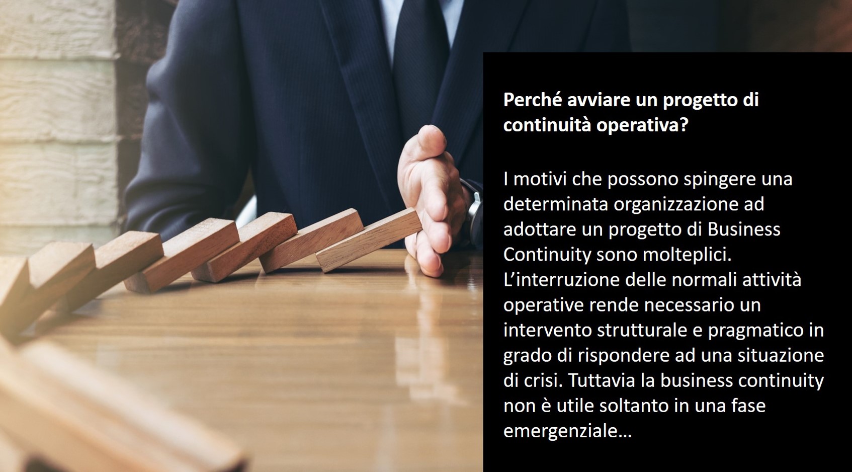 Proprio alla luce degli eventi in atto e della loro natura si rivela decisiva per una organizzazione la salvaguardia e l’adozione di un piano di continuità operativa o business continuity plan. Con questi termini si indica la capacità di un’azienda di mettere in atto misure preventive che consentano di rispondere in modo efficace ad una crisi più o meno inattesa. In altri termini, il piano di continuità operativa permette ad una organizzazione di rispondere nel minor tempo e in modo più efficace ad un evento “distruttivo”.